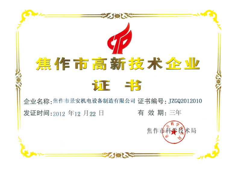 焦作市高新技術(shù)企業(yè)證書(shū)
