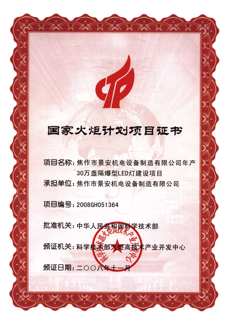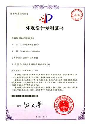 礦用LED隔爆型巷道圓燈專(zhuān)利證書(shū)